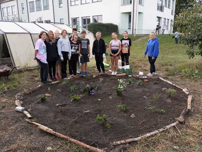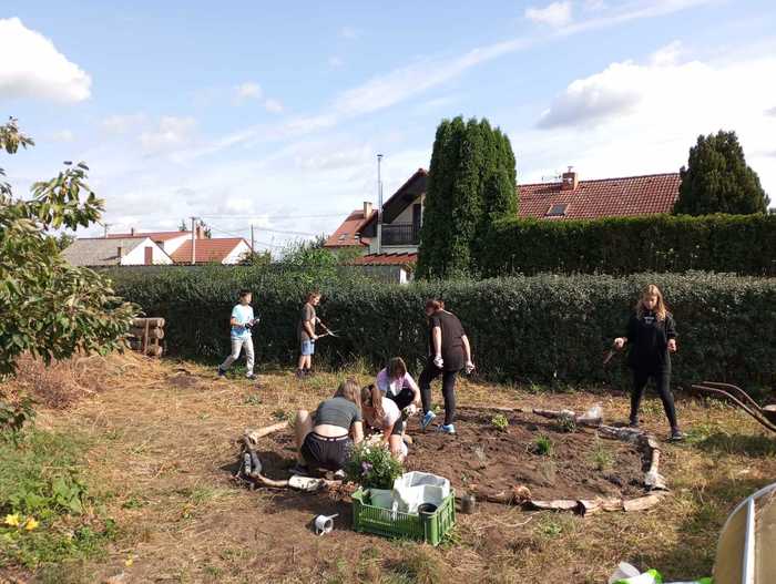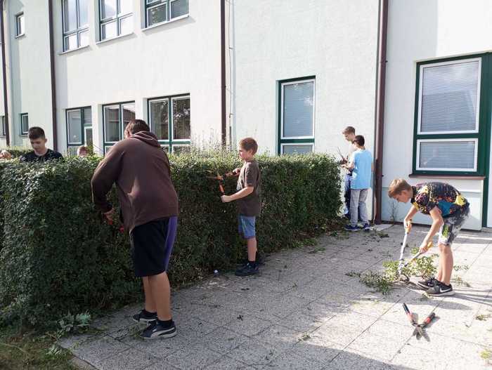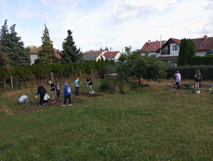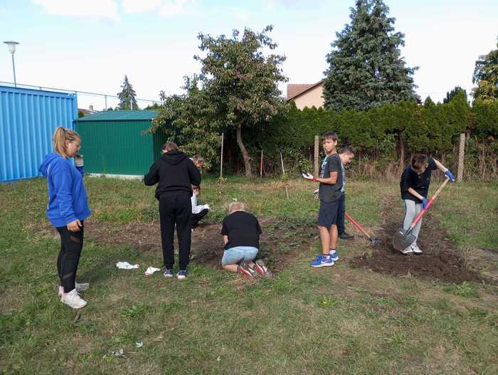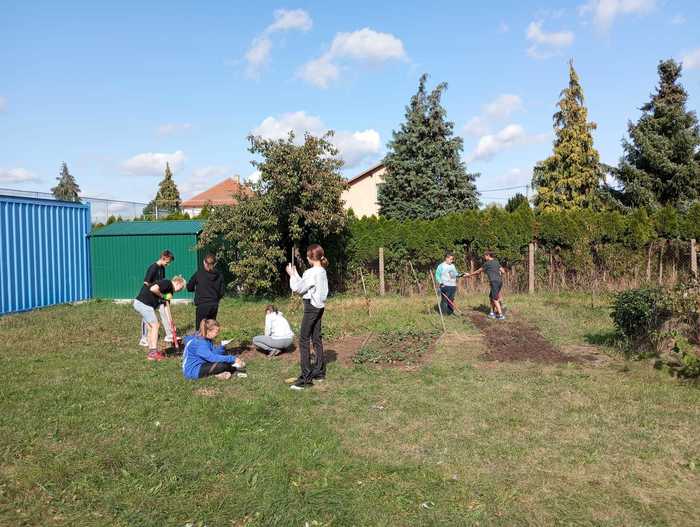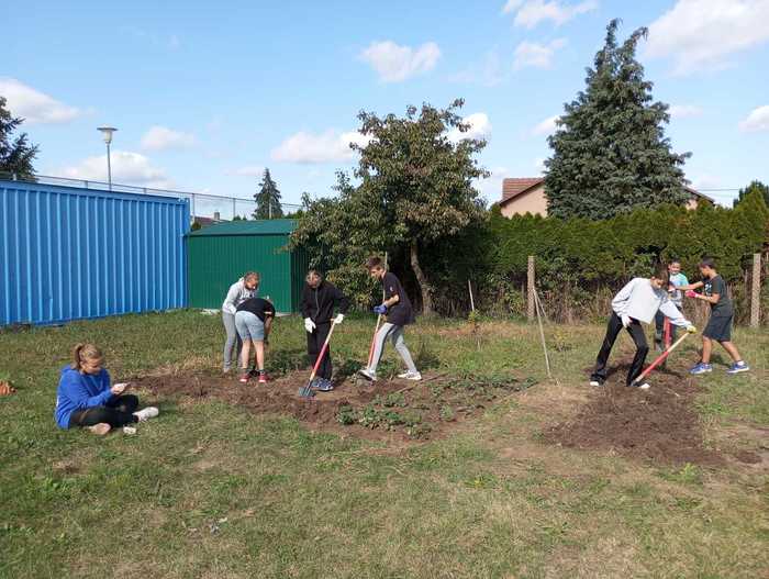 Díky pracovitosti žáků sedmé třídy vznikly dva nové záhony jahod a bylinek. Kluci také zvládli ostříhat zbývající keře. Dobrá práce, sedmáci! :-)